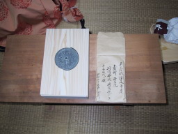 銅製、径20cm余り、中心部は数cm、左側に応永9年11月1日。(その他にも刻字多数) |